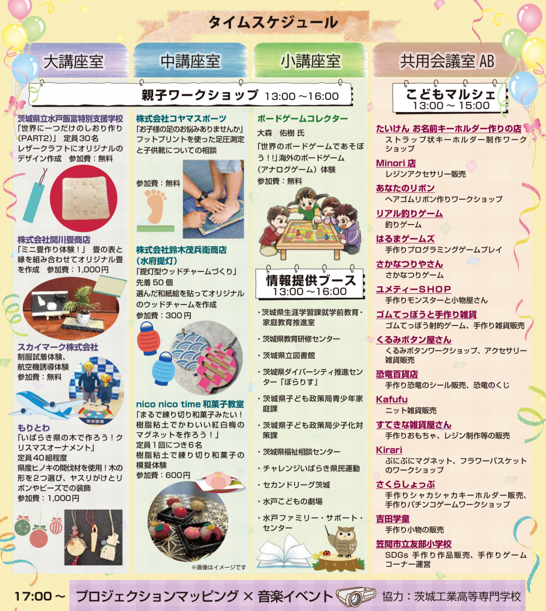 ※ 親子ワークショップへの参加、こどもマルシェ内の物販・ワークショップ参加には料金がかかります。詳しくは、下記タイムスケジュール・イベント詳細をご覧ください。